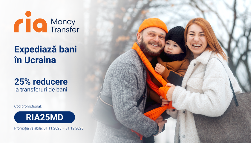 Între 01 noiembrie și 31 decembrie 2025, folosind codul promoțional RIA25MD, poți beneficia de 25% reducere la comisionul fiecărui transfer din Republica Moldova către Ucraina. Și partea cea mai faină: codul poate fi folosit de câte ori vrei, fără limite!