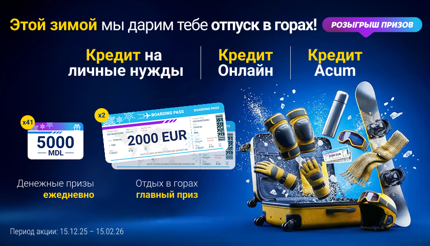 С 15 декабря 2025 по 15 февраля 2026 года каждый, кто оформит кредит на личные нужды, онлайн-кредит или кредит ACUM, будет автоматически участвовать в розыгрышах призов, которые проходят на протяжении всей кампании.