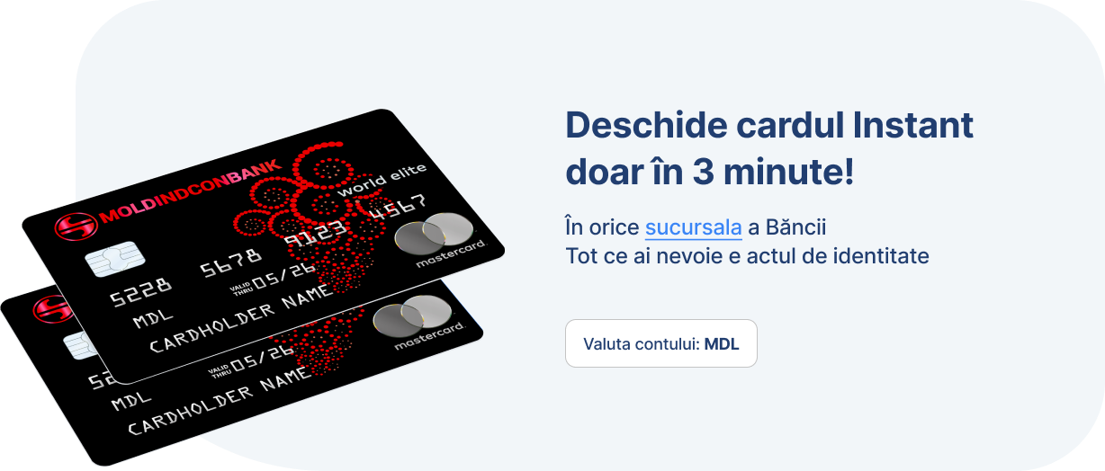 Нет причин откладывать открытие кредитной линии на сумму до 500 000 леев на вашей карте и пользоваться всеми уникальными привилегиями и эксклюзивными возможностями, которые предоставляет вам статус клиента Premium Exclusive в BC Moldindconbank S.A.
